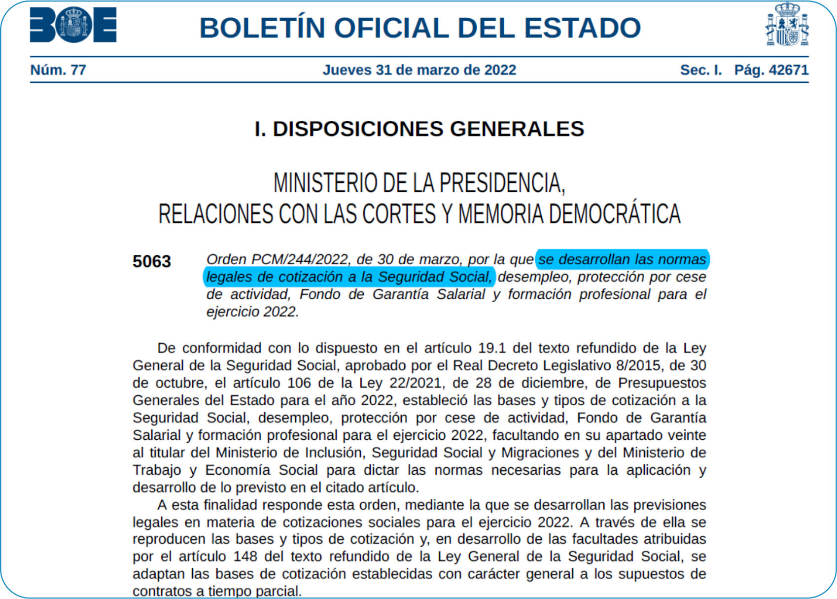 O 31 de marzo de 2022, o Ministerio da Presidencia, Relaciones con las Cortes y Memoria Democrática publicou no Boletín Oficial do Estado a Orde PCM/244/2022, do 30 de marzo pola que se desenvolven diversas normas legais no relativo á cotización á Seguridade Social e máis concretamente en materia de cotizacións sociais, con efectos retroactivos desde o 1 de xaneiro de 2022.